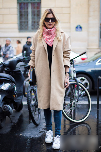 駝色大衣隨處可見,搭配彩色紅格圍巾立馬精神,襯托靚麗的膚色,時尚潮流。