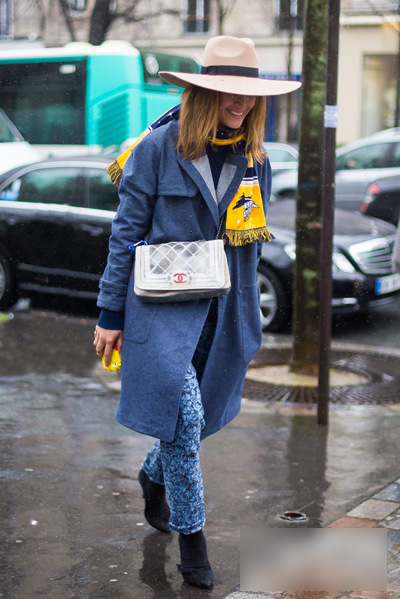 藍(lán)色外套,配上黃藍(lán)圍巾,黃色色彩絢麗,在暗淡的秋冬季節(jié)增添一抹炫麗色彩。