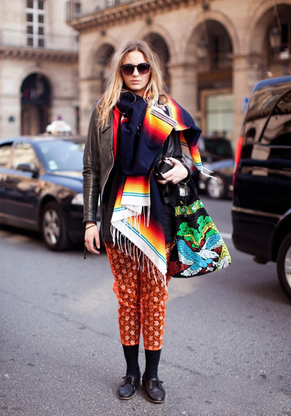 黑色漆皮外套搭配橙色印花七分褲,下身搭配黑色長襪與皮鞋,圖騰休閑包,本身造型感已十分出彩,搭配漸變色毛毯式披肩,色彩鮮艷,盡顯休閑隨意之余,也著實是緊跟潮流的時尚搭配之一。