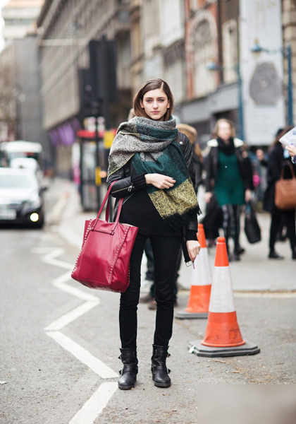 黑色皮質(zhì)外套搭配黑色毛衣,下身是黑色緊身褲與黑色金屬扣飾短靴,紅色休閑皮包,毛毯披肩的加入,讓整個造型更添冬日氣息,增加色彩元素。
