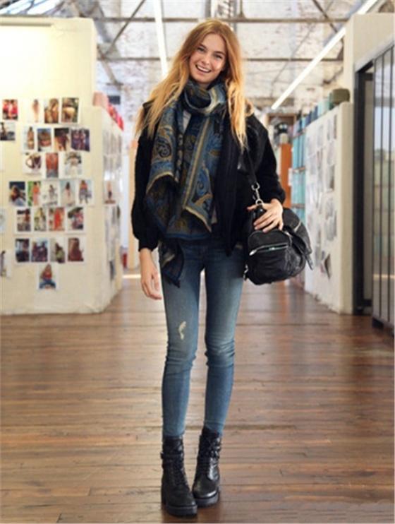 華麗的印花圍巾給人一種奢侈的感覺,搭配簡答的緊身牛仔褲,馬丁靴和黑色短款外套,干練而優雅的氣質迎面而來。