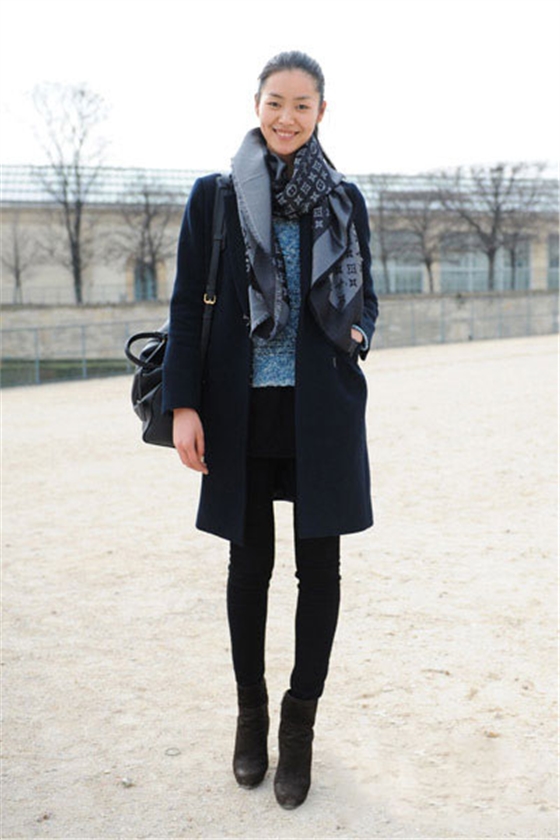 著名名模劉雯的曾有一個毛衣和羊絨圍巾的時尚搭配:印花打底衫外披一件深藍(lán)色毛呢大衣,穿著黑色修身長褲和黑色短靴,一條LV印花羊絨圍巾加上黑色單肩包,大氣中盡顯時尚氣息。