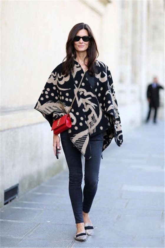 另一國外明星的時尚搭配也是讓人眼前一亮:黑色打底衫配上印花羊絨圍巾,身穿緊身牛仔褲,一雙平底鞋和YSL斜挎包,休閑中不失完美。